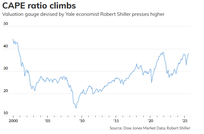 The CAPE ratio (cyclically adjusted price-to-earnings ratio) is a key indicator of long-term stock market valuations. It compares the S&P 500 index to the average inflation-adjusted earnings of its constituents over the past decade, eliminating the impact of short-term fluctuations. Since the beginning of this bull market, the ratio has continued to climb: nearing 38 at the end of August, reaching its highest level since the end of 2021. More importantly, experts point out that it has broken through 40, matching the level seen during the bursting of the dot-com bubble in 2000. Given the recent rally in US stocks, this figure is likely to rise further.