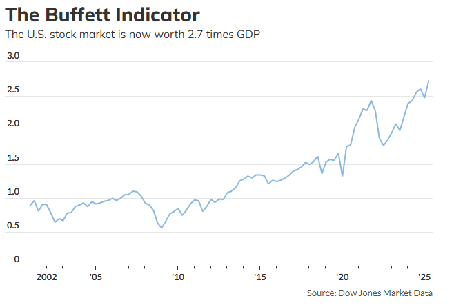 The "Buffett Indicator": The ratio of stock market capitalization to GDP has reached its highest level since 2001